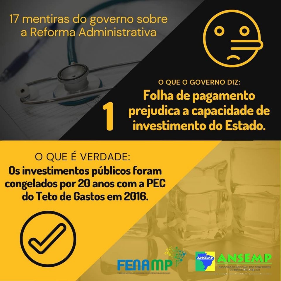 O governo diz que o custo da folha de pagamento prejudica a capacidade de investimento do Estado. A verdade é que os investimentos públicos foram congelados por 20 anos pela PEC do Teto de Gastos (EC 95/2019), que teve, inclusive, o voto favorável do então deputado Jair Bolsonaro.