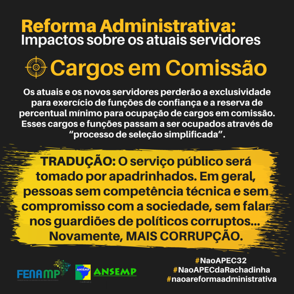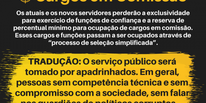 Com a Reforma Administrativa, os atuais e os novos servidores perderão a exclusividade para exercício de funções de confiança e a reserva de percentual mínimo para ocupação de cargos em comissão. Com isso, o serviço público será tomado por apadrinhados políticos.