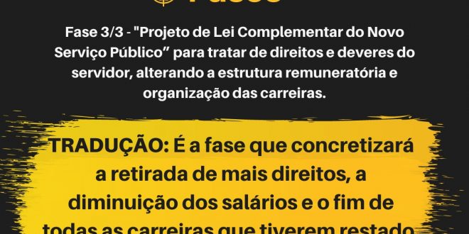 O governo alega que a Reforma Administrativa não terá impacto sobre os atuais servidores. No entanto, as análises técnicas e jurídicas que vêm sendo realizadas evidenciam a falácia desse discurso. A Reforma está dividida em três fases. Na terceira fase, onde o governo diz que irá tratar dos direitos e deveres do servidor, a verdade será concretizada a retirada de mais direitos, a diminuição dos salários e o fim de todas as carreiras que tiverem restado.