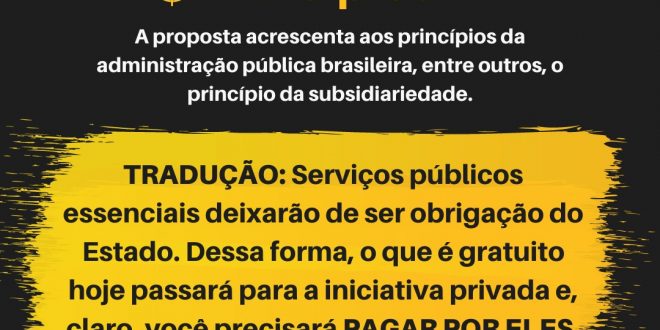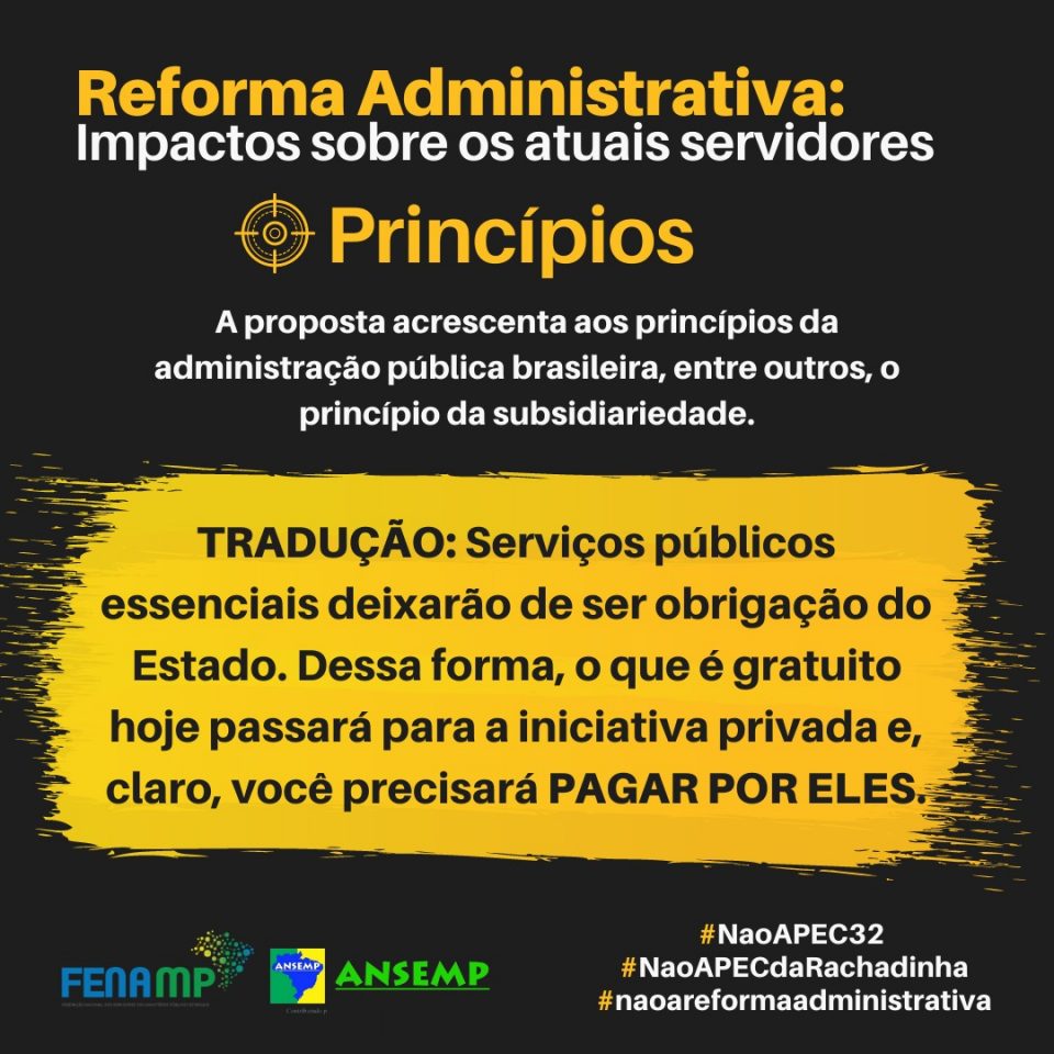 O governo alega que a Reforma Administrativa não terá impacto sobre os atuais servidores. A verdade é que a Reforma irá afetar não apenas os atuais e novos servidores, mas toda a população. Com a mudança nos princípios da administração pública, serviços públicos essenciais deixarão de ser obrigação do Estado, podendo passar para a iniciativa privada, que cobrará por eles.