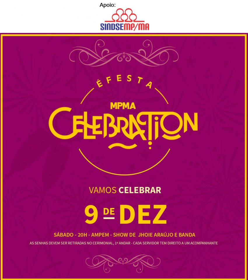 No próximo sábado (09), celebraremos o fim de mais um ano de trabalho e avanços do Ministério Público do Estado do Maranhão (MP/MA). Por meio da parceria entre o Sindsemp/MA e a Procuradoria Geral de Justiça (PGJ), servidores e membros se confraternizarão na “MP/MA Celebration”, a ser realizada a partir das 20h na sede da Ampem, localizada na Rua Duque Bacellar, s/nº – Quintas do Calhau.