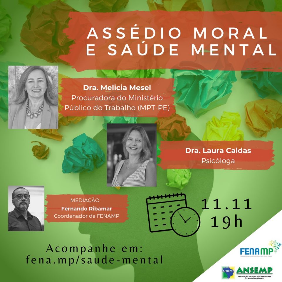 A Fenamp e a Ansemp promovem, na próxima quarta-feira (11), às 19h, uma live para discutir Assédio Moral e seus impactos na Saúde Mental. A transmissão terá a participação da procuradora do Ministério Público do Trabalho (MPT-PE), Melicia Mesel, e da psicóloga Laura Caldas. A mediação do debate será do coordenador da Fenamp, Fernando Ribamar. Na ocasião, será lançada a Cartilha sobre Assédio, elaborada pelo Sindsemp/BA, em parceria com o Sindsemp/MA e Sindsemp/RJ.