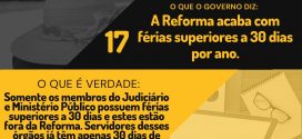 O governo diz que a Reforma acaba com férias superiores a 30 dias por ano. A verdade é que somente os membros do Judiciário e Ministério Público possuem férias superiores a 30 dias e estes estão fora da Reforma. Servidores desses órgãos já têm apenas 30 dias de férias por …