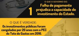 O governo diz que o custo da folha de pagamento prejudica a capacidade de investimento do Estado. A verdade é que os investimentos públicos foram congelados por 20 anos pela PEC do Teto de Gastos (EC 95/2019), que teve, inclusive, o voto favorável do então deputado Jair Bolsonaro.