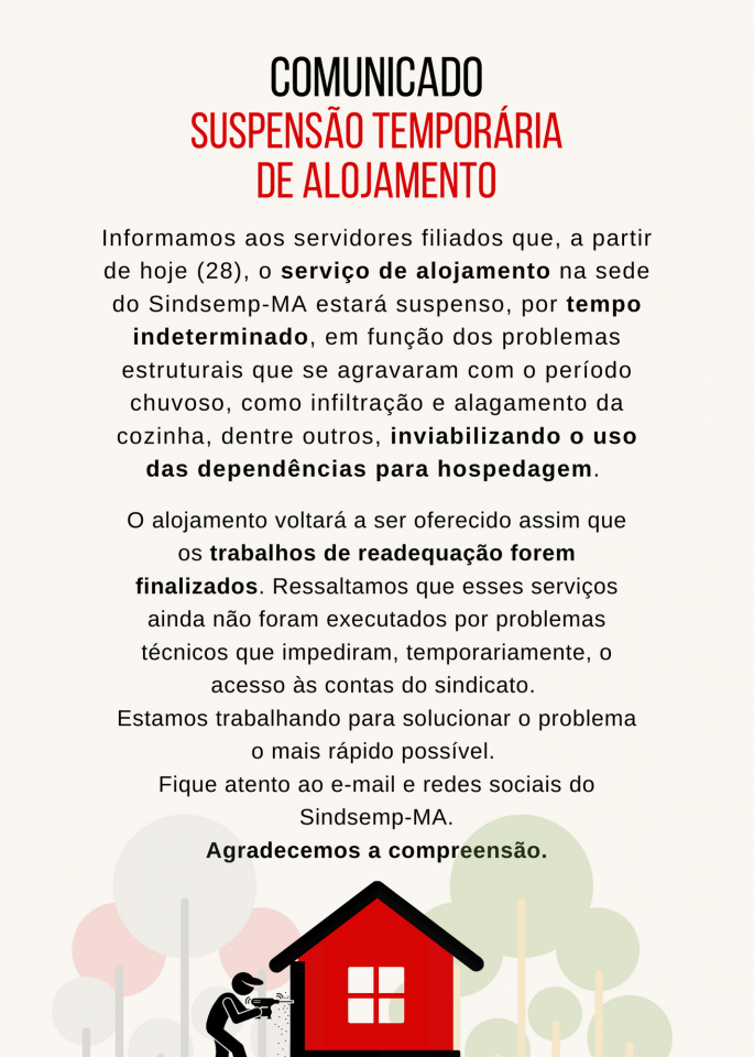 Comunicado: suspensão temporária de reserva de alojamento no Sindsemp-MA