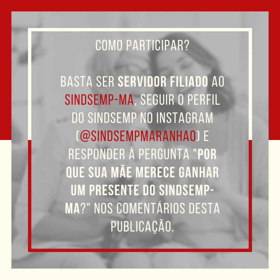 Para participar, basta ser servidor do MPMA filiado ao Sindsemp-MA, seguir o perfil do sindicato no Instagram (@sindsempmaranhao) e responder à pergunta “Por que sua mãe merece um presente do Sindsemp-MA” na publicação oficial em nosso perfil. É só acessar este link clicando aqui. O comentário com maior número de curtidas até as 12:00 do dia 03/05 será o vencedor. Participe!