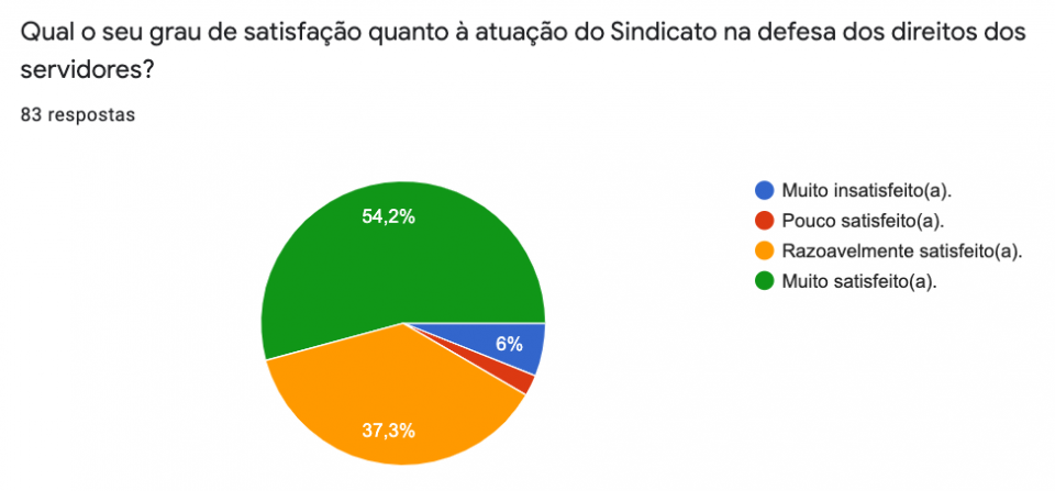 Olá, servidor! No mês de maio, lançamos um formulário de satisfação para conhecer melhor as demandas e ouvir as sugestões de nossos filiados, com o objetivo de construir um sindicato cada vez mais forte e atuante para a nossa categoria.