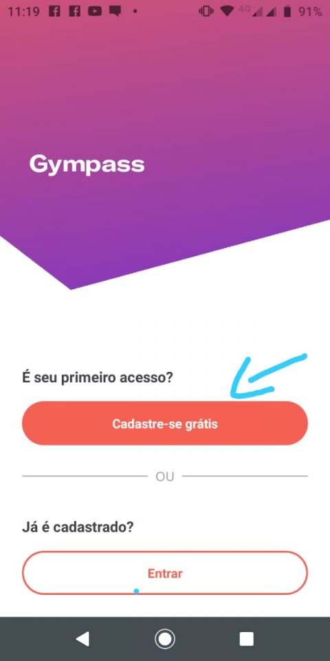 1- Após baixar o aplicativo, clique em Cadastre-se grátis