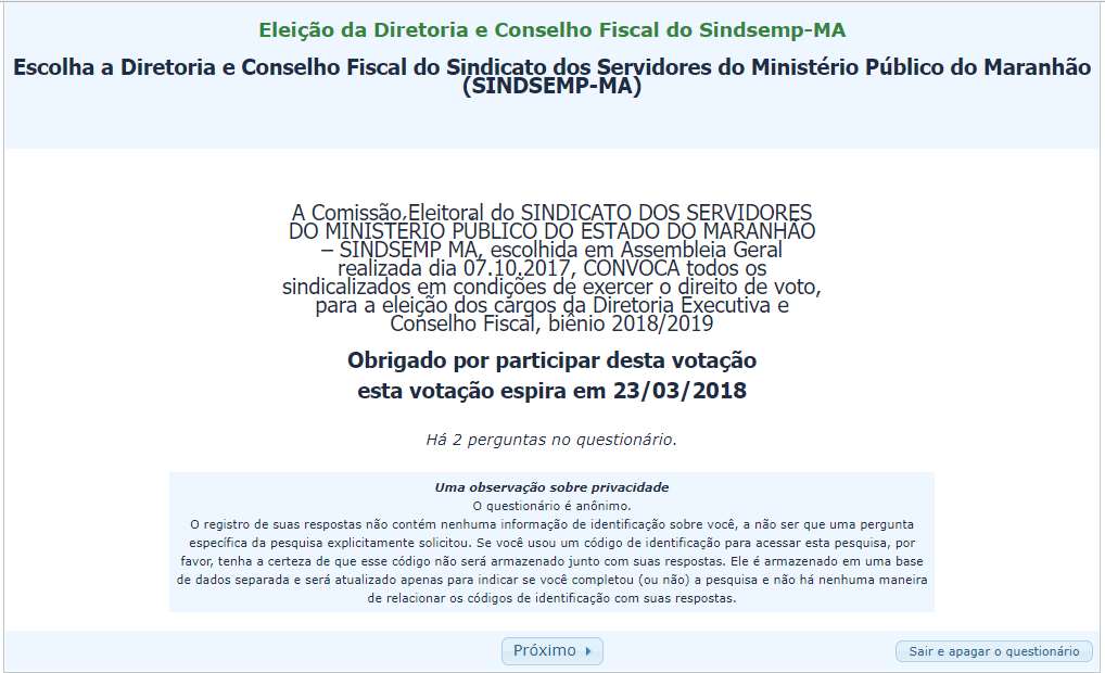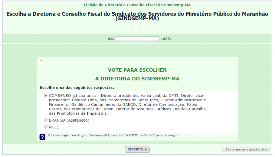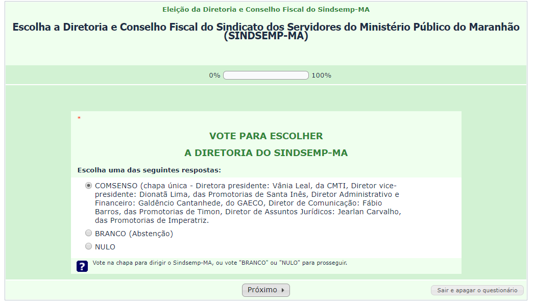 2) Na tela seguinte, vote para a Diretoria do Sindsemp/MA e clique em “Próximo”.