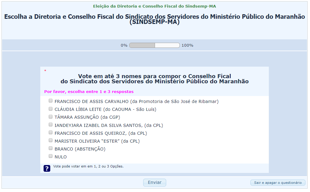 3) Na tela seguinte, vote para o Conselho Fiscal do Sindsemp/MA (até 3 nomes) e clique em “Enviar”.