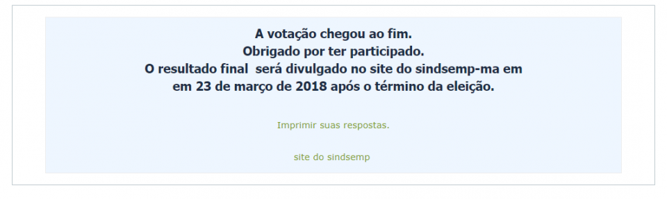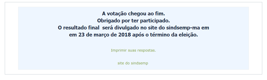 Nosso sistema encaminhou um link de acesso à votação para o e-mail de cada servidor sindicalizado. Cada pessoa poderá votar apenas uma vez e, após concluir a escolha, o usuário receberá um novo e-mail que confirmará sua participação na pesquisa.