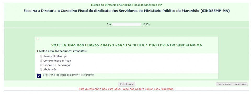 O sistema apresentará, em ordem alfabética, as três opções de chapas para escolha do usuário. Também há possibilidade de abstenção. Selecionando a opção desejada, o votante deve clicar em “Próximo”.