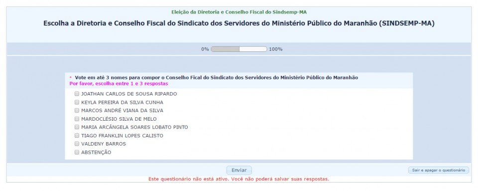 Em seguida, o usuário será encaminhado para a página de escolha dos candidatos ao Conselho Fiscal. O usuário poderá selecionar até três nomes dentre os sete listados, com possibilidade de abstenção. Finalizada a tarefa, clique no botão “Enviar” para que o sistema registre seu voto.