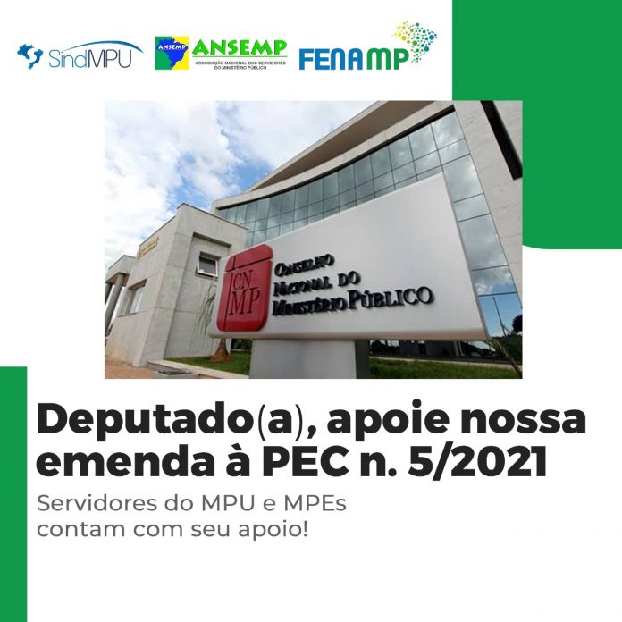 O Sindicato Nacional dos Servidores do Ministério Público da União, do Conselho Nacional do Ministério Público e da Escola Superior do Ministério Público da União (SindMPU), a Federação Nacional dos Trabalhadores dos Ministérios Públicos Estaduais (FENAMP) e Associação Nacional dos Servidores do Ministério Público (ANSEMP) vêm, por meio deste, solicitar à Vossa Excelência apoiamento a emenda à PEC nº 005, de 2021, que “Altera artigo 130-A da Constituição Federal no que trata da composição do Conselho Nacional do Ministério Público e dá outras providências”, de autoria do Deputado Orlando Silva.