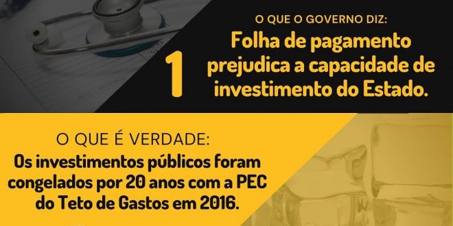 O governo diz que o custo da folha de pagamento prejudica a capacidade de investimento do Estado. A verdade é que os investimentos públicos foram congelados por 20 anos pela PEC do Teto de Gastos (EC 95/2019), que teve, inclusive, o voto favorável do então deputado Jair Bolsonaro.