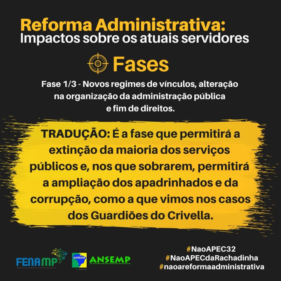 O governo alega que a Reforma Administrativa não terá impacto sobre os atuais servidores. No entanto, as análises técnicas e jurídicas que vêm sendo realizadas evidenciam a falácia desse discurso. Diversos pontos da PEC poderão impactar, imediatamente ou por mudanças futuras, os atuais servidores. Por isso, a FENAMP e a ANSEMP preparam uma série de cards informativos sobre esses impactos e mudanças.