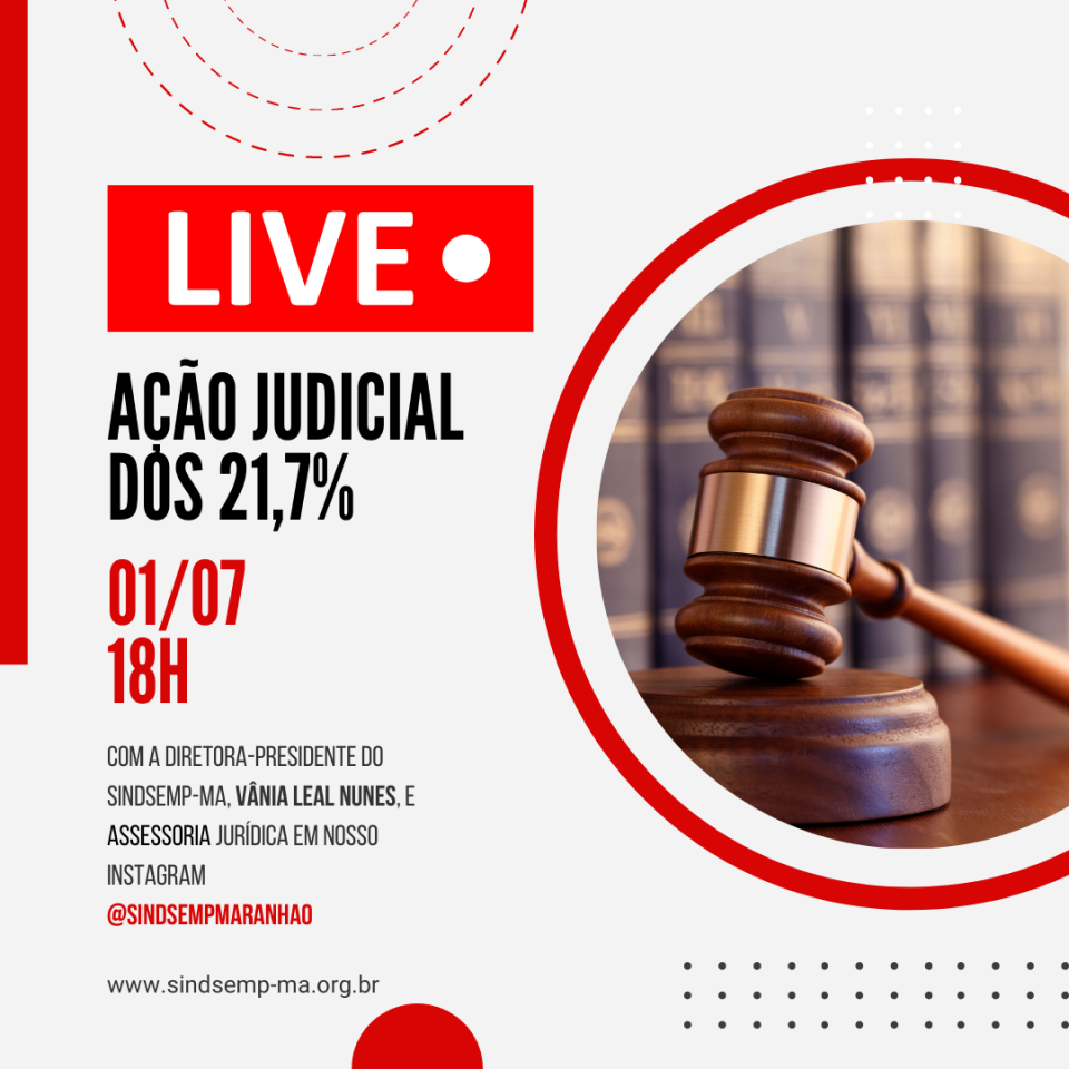 Nesta quinta-feira (01), às 18h, teremos uma live em nosso Instagram (@sindsempmaranhao) com a diretora-presidente, Vânia Leal Nunes, e nossa assessoria jurídica, em que vamos tirar todas as suas dúvidas sobre a execução da ação judicial dos 21,7%.