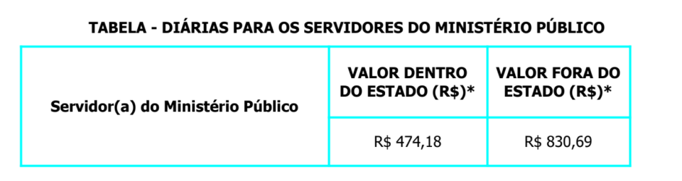 - A fixação das diárias em valor único para todos os servidores do MPMA, sem qualquer distinção e/ou escalonamento por cargo público, devendo ser considerado o valor devido ao cargo comissionado de Diretor-Geral, na forma da tabela abaixo: