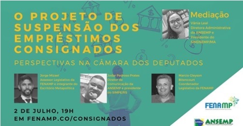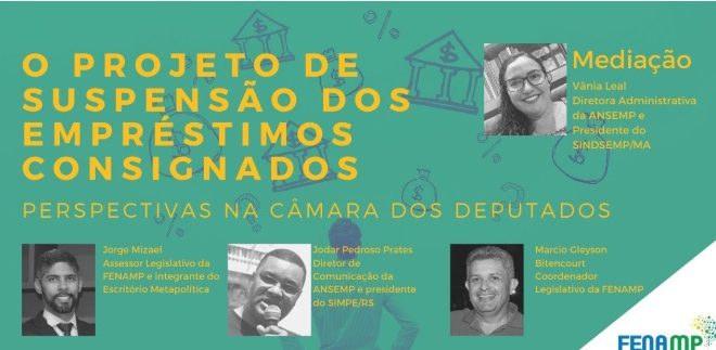Nesta quinta-feira (02), às 19h, a Fenamp e a Ansemp realizam debate com tema “O projeto de suspensão dos empréstimos consignados – Perspectivas na Câmara dos Deputados”. A discussão tem o objetivo de atualizar os colegas sobre os movimentos políticos das entidades em relação à suspensão do pagamento dos consignados, devido à pandemia de coronavírus Sars-CoV-2 (Covid-19). A transmissão será feita por meio do canal da Fenamp no Youtube e das redes sociais da Ansemp e da Federação.